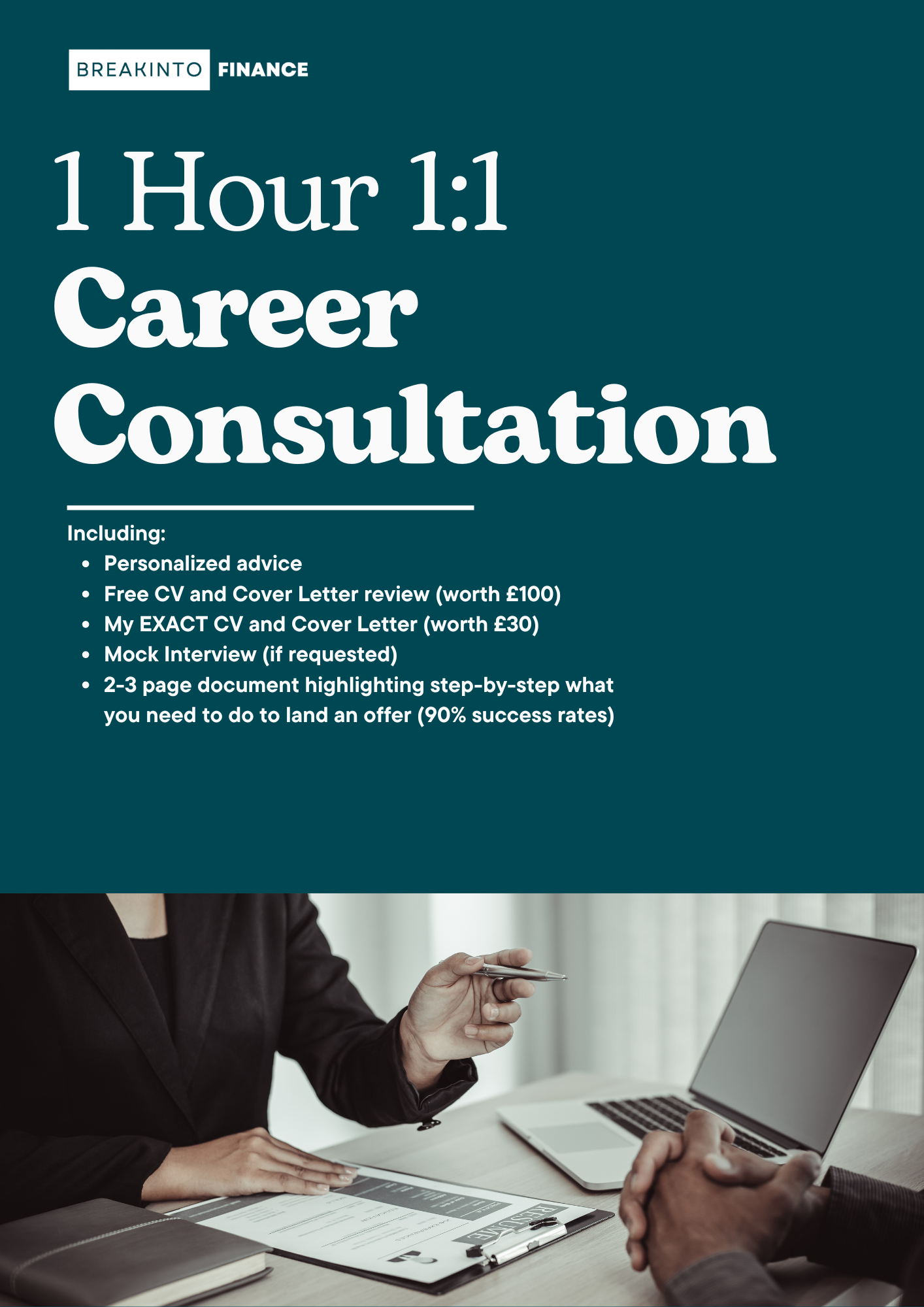 I offer 1-1 personalised career consultations and have helped 20+ students land £100k+ careers in companies such as Goldman Sachs, JP Morgan, Evercore, Lazard, Dare Trading, DC Advisory, Societe Generale, Lloyds Bank and Aztec Group.